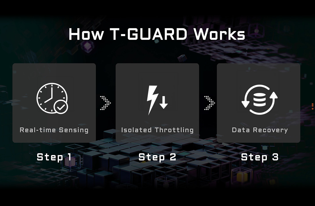 2. Intelligent Power Throttling: Upon detecting abnormal temperatures, T-Guard strategically caps GPU power. This proactive cooling prevents cable melting while maintaining system power to protect other components.